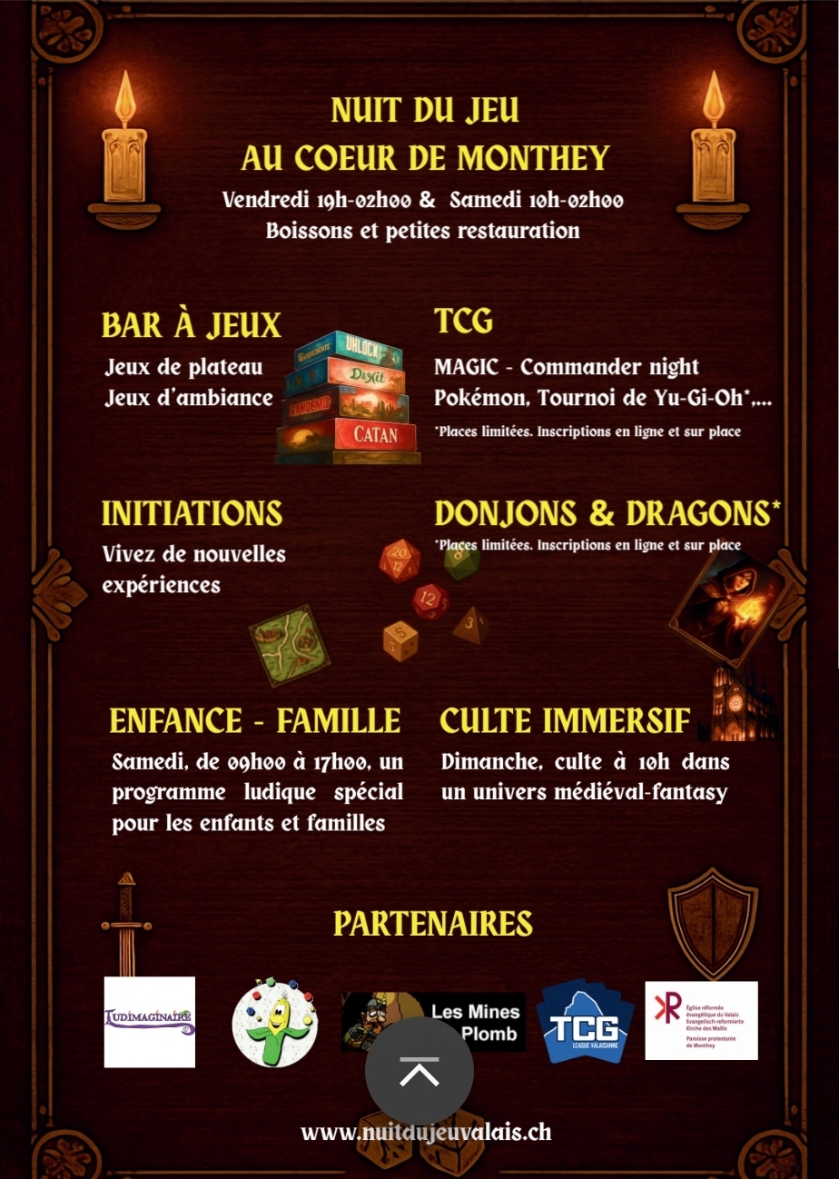 NUIT DU JEU – MONTHEY – SAVE THE DATE 09-10 JANVIER 2026 Nom Prénom Téléphone Adresse e-mail Inscriptions Inscriptions Inscription "Donjons & Dragons" - VENDREDI SOIR Inscription "Donjons & Dragons" - SAMEDI SOIR Inscription Tournoi " Yu-Gi-Oh!" - SAMEDI APRÈS-MIDI Être bénévole Message 1 + 6 = Envoi