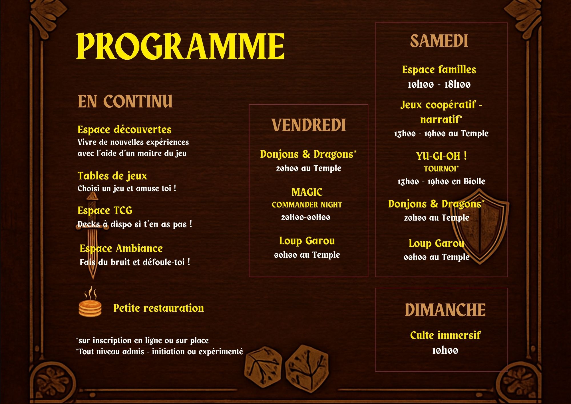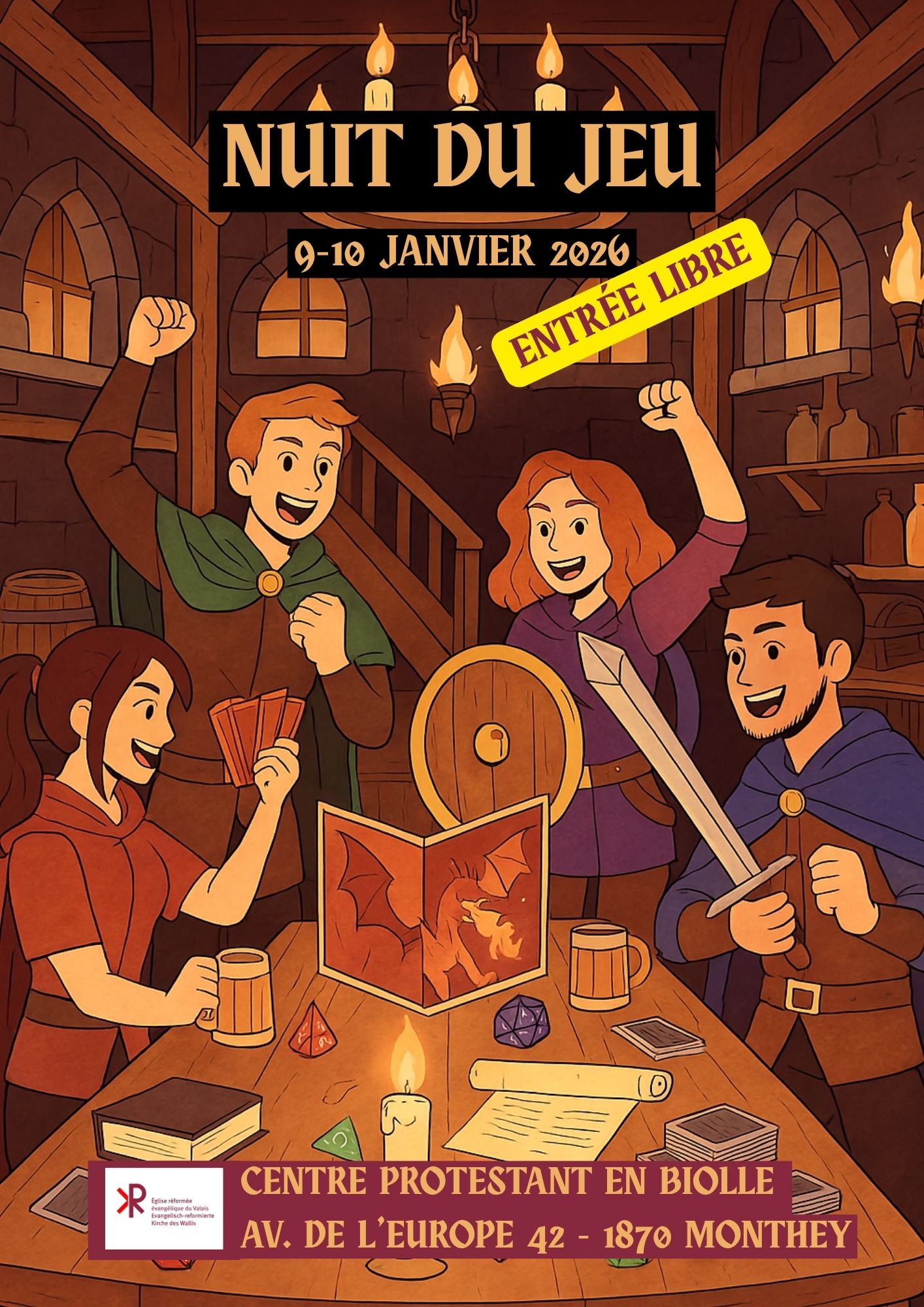 NUIT DU JEU – MONTHEY – SAVE THE DATE 09-10 JANVIER 2026 INSCRIPTION à D&D et Yu-Gi-Oh ou S’engager comme bénévole ! Nom Prénom Téléphone Adresse e-mail Inscriptions Inscriptions Inscription "Donjons & Dragons" - VENDREDI SOIR Inscription "Donjons & Dragons" - SAMEDI SOIR Inscription Tournoi " Yu-Gi-Oh!" - SAMEDI APRÈS-MIDI Être bénévole Message 3 + 7 = Envoi